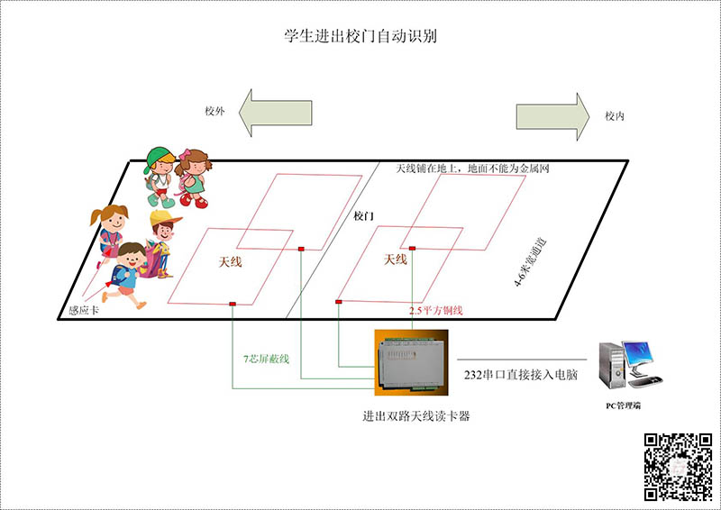 远距离读卡器外接地埋天线,门内和门外各一组,像教室这种门比较窄的,可以只用一个线圈,来用于识别学生出入识别。