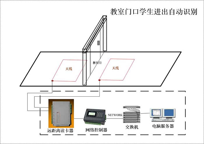 当学生携带卡片,从门外走向门内时,门口的地埋天线可以识别到学生身上的卡片,并把卡号发送给网络控制器,网络控制器保存好卡号,同时把卡号和时间等相关信息通过网络上传给电脑服务器上的软件,软件得到卡号和时间,保存起来供管理员查询。
